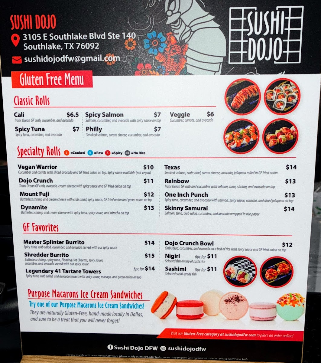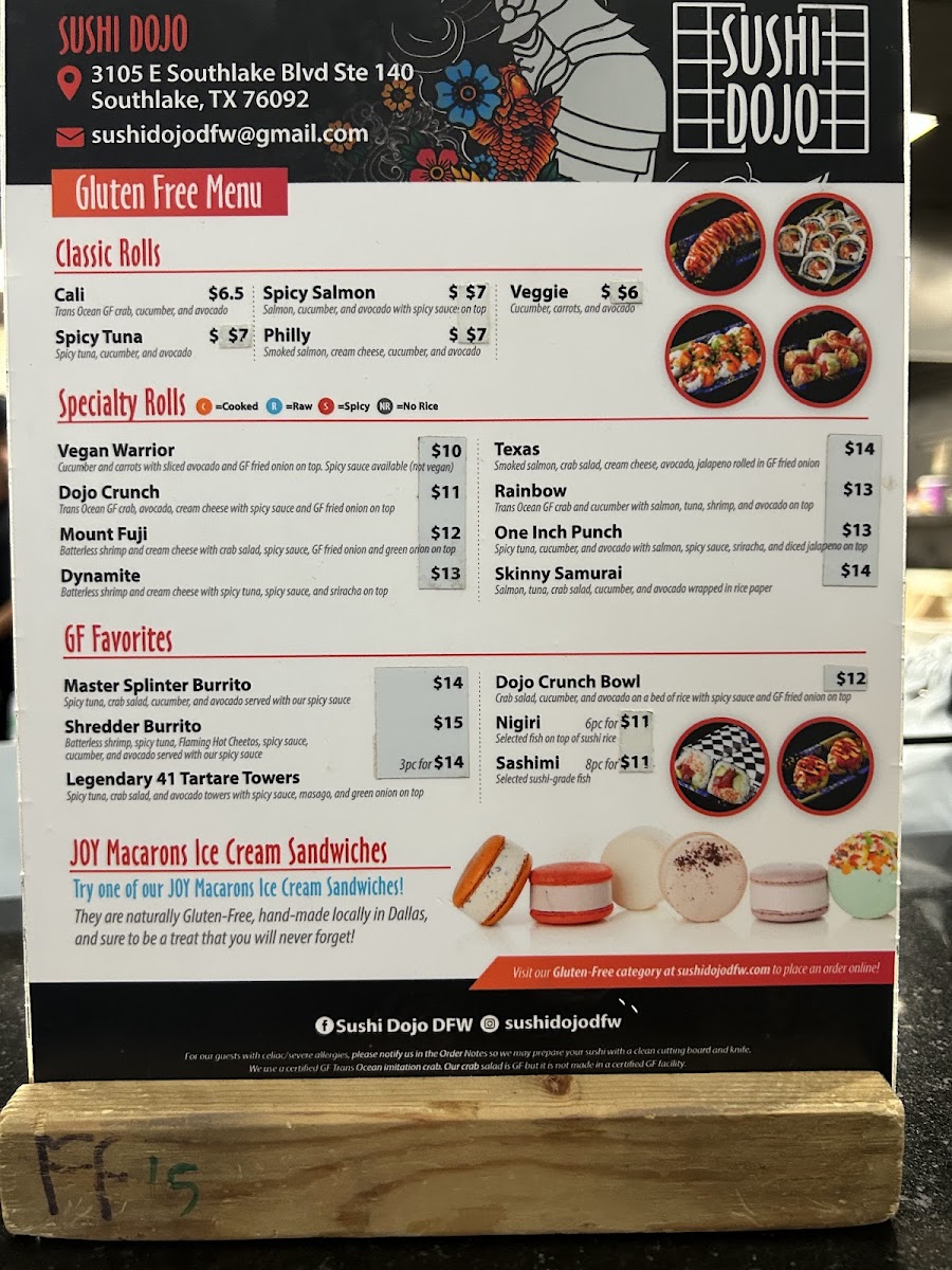 Salmon, tuna, crab salad, cucumber, and avocado wrapped in rice paper *For our guests with celiac/severe allergies, select "Please avoid gluten cross-contamination" and we will prepare your sushi with a clean cutting board and knife. Our crab salad is GF but it is not made in a certified GF facility. There is an option to replace the crab salad with spicy tuna. *The variety in the photo is our Gluten version. Your order will be modified to be GF.