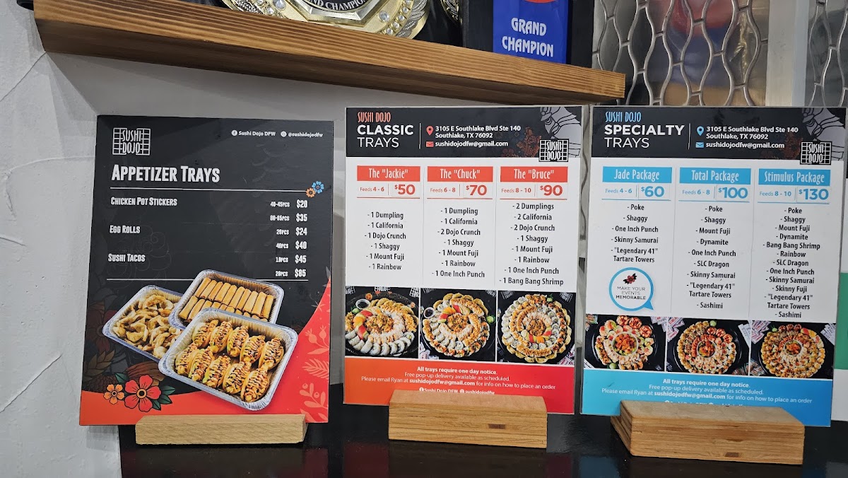 Small Classic Tray that typically feeds 4-6. 1 Cali 1 Dojo Crunch 1 Shaggy 1 Mount Fuji 1 Rainbow 6pc Chicken Pot Stickers *Please allow additional prep time for party trays